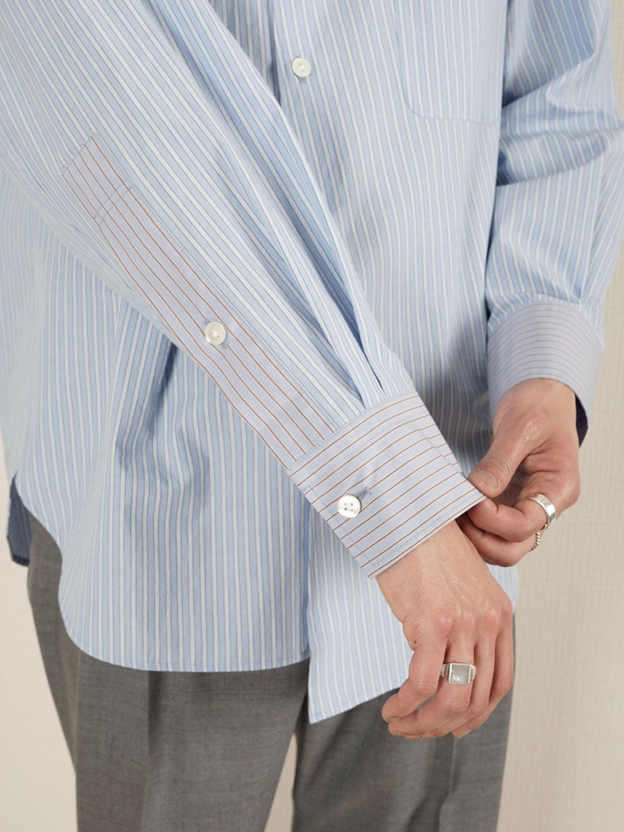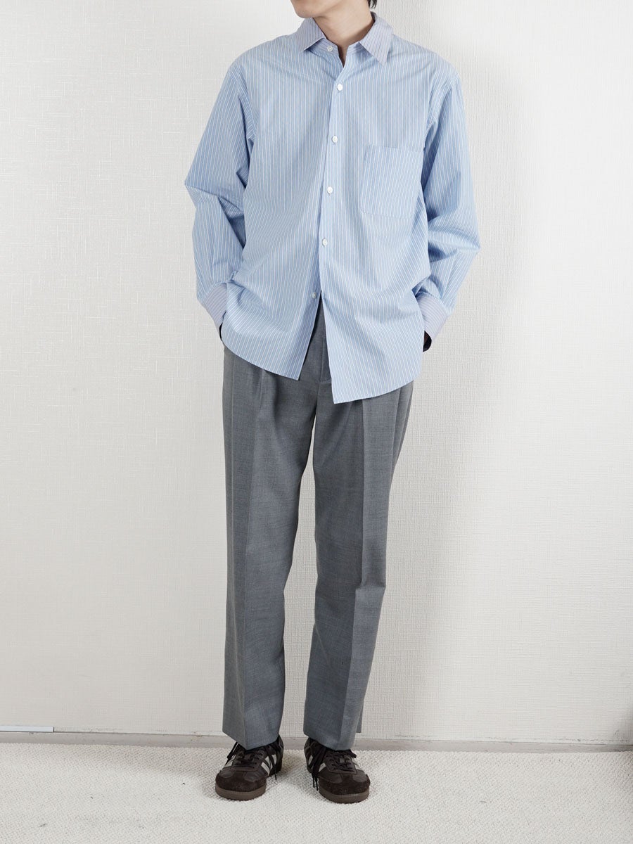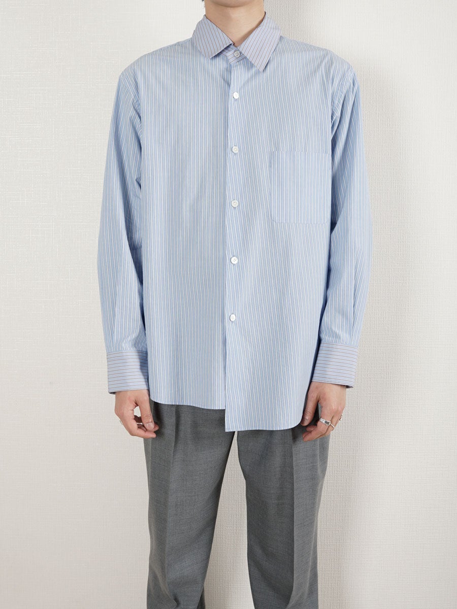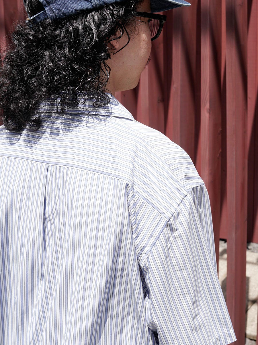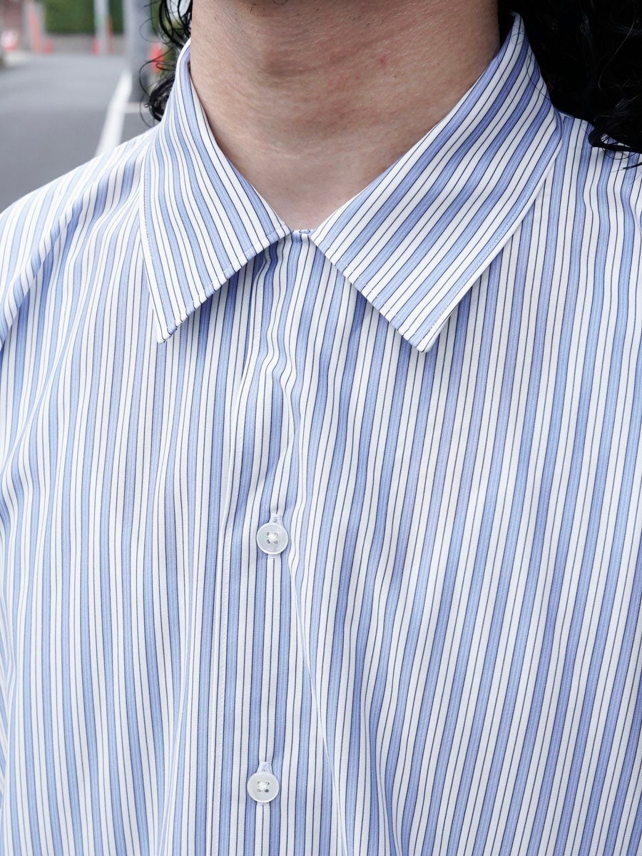 他の画像を見る KANEMASA PHIL. (カネマサフィル) 46G Stripe Ether Shirt[SAX] ¥ 24,200 税込 販売期間 2026/04/18 12:00 〜 お気に入りに登録する