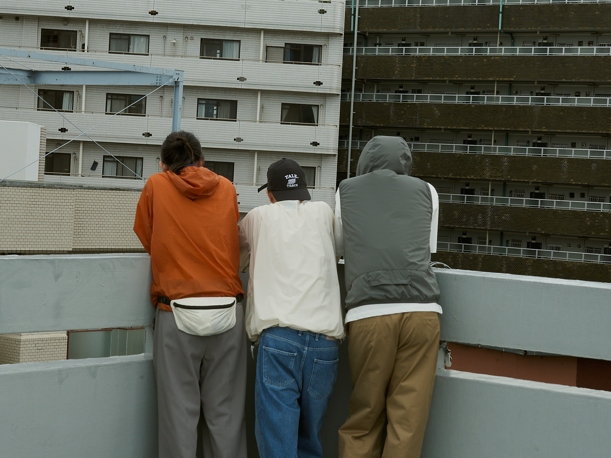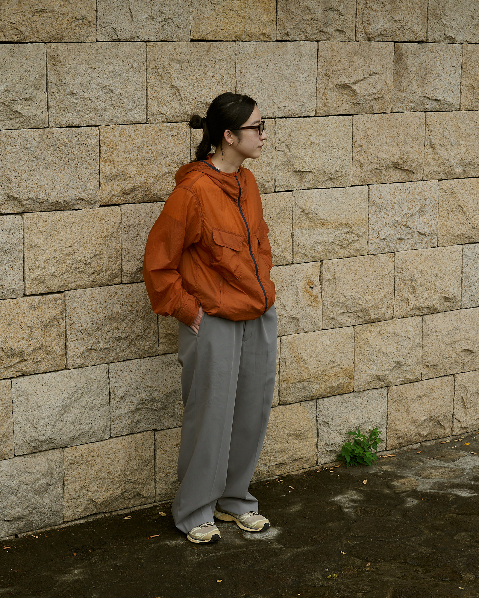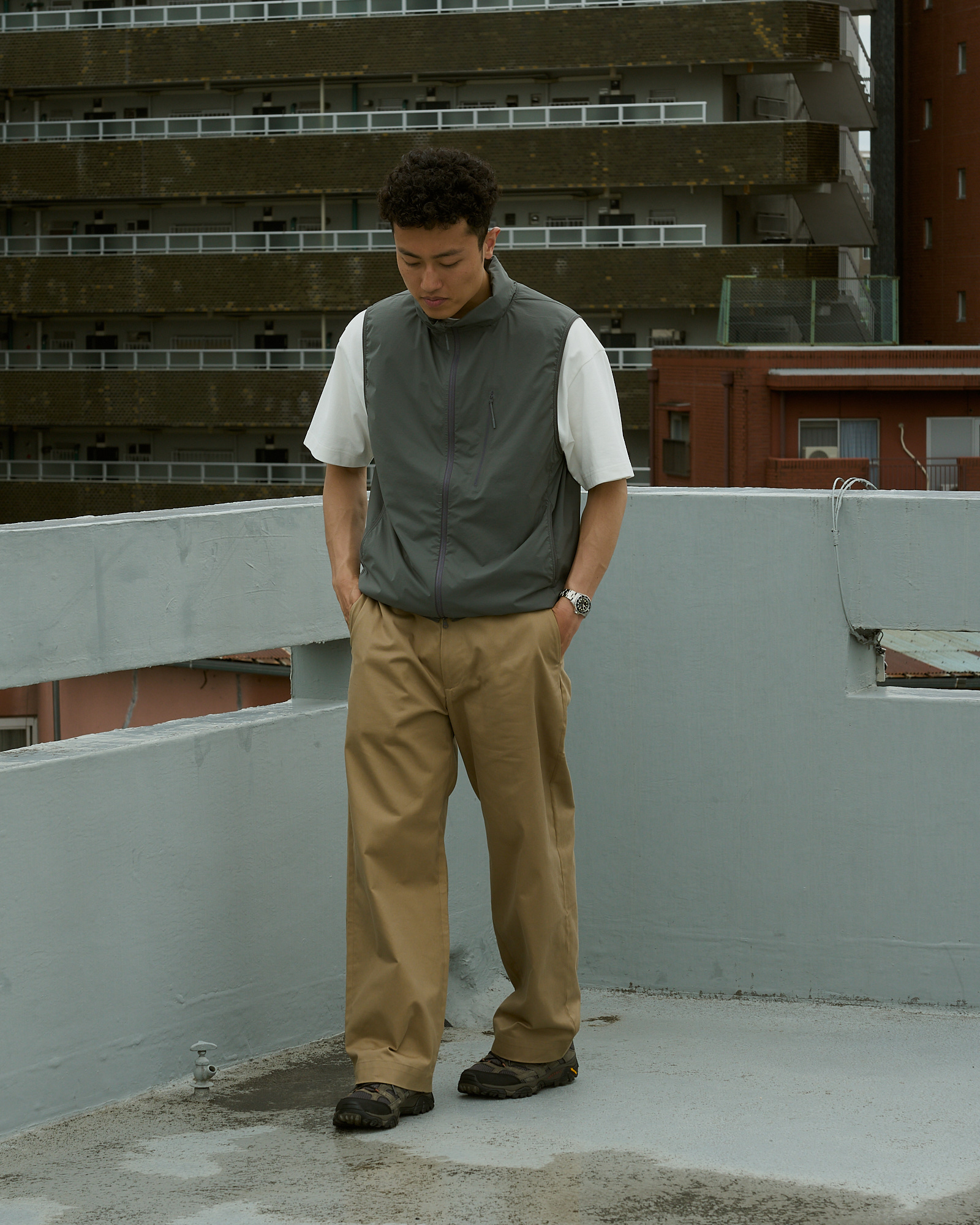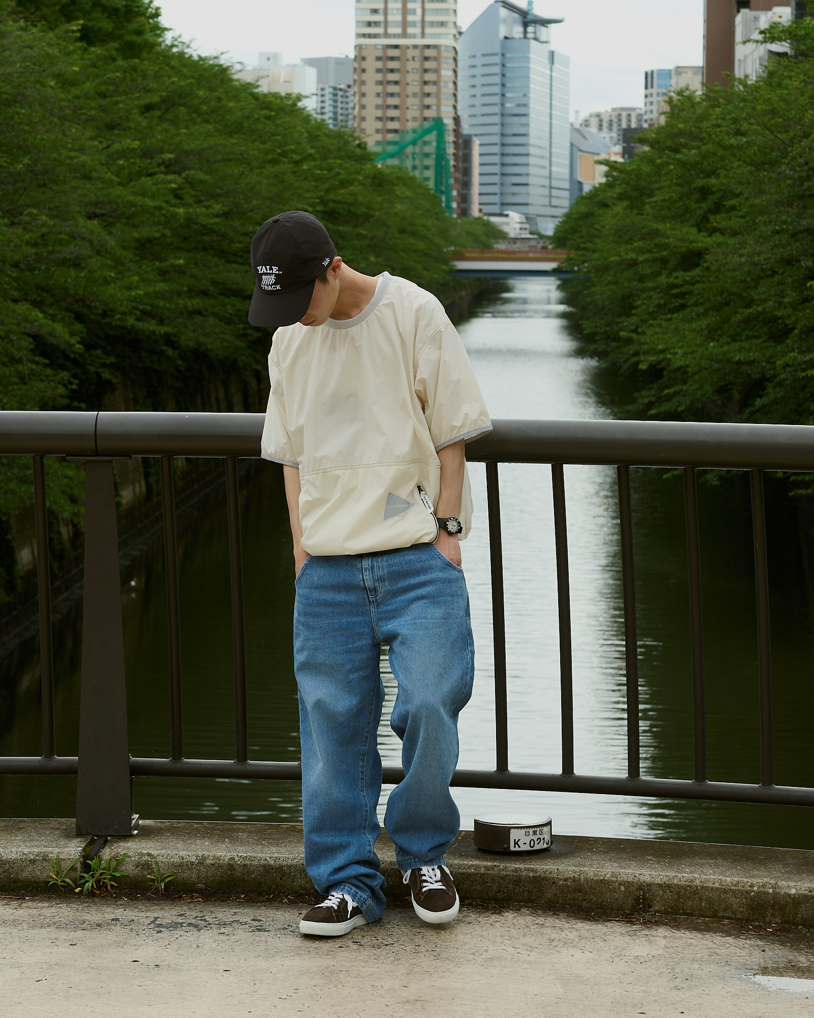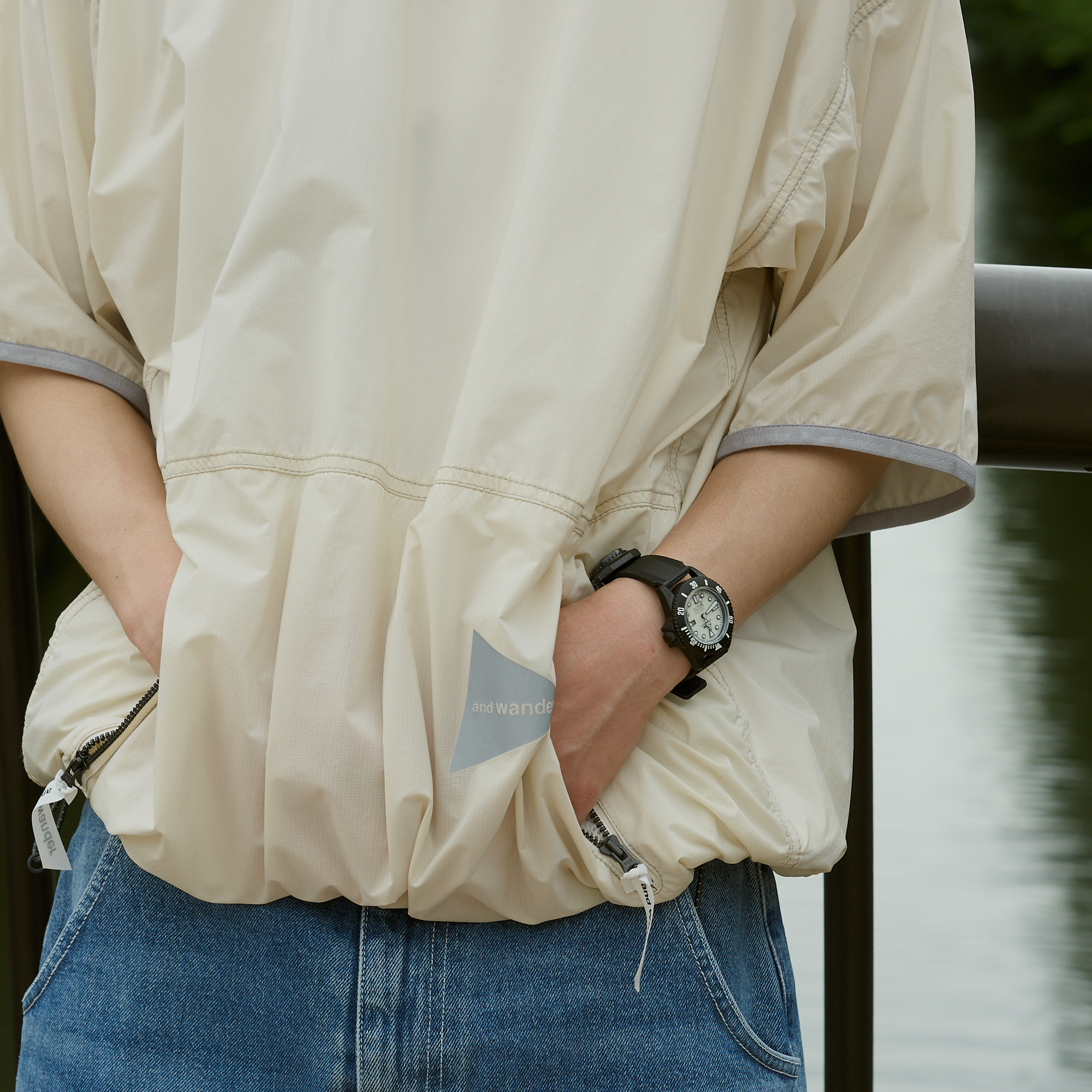 でも普通じゃつまらない。雨が降ったら傘をさすところを、COMESANDGOESのナイロン素材のキャップやand wanderを纏うという違和感が面白く楽しい。