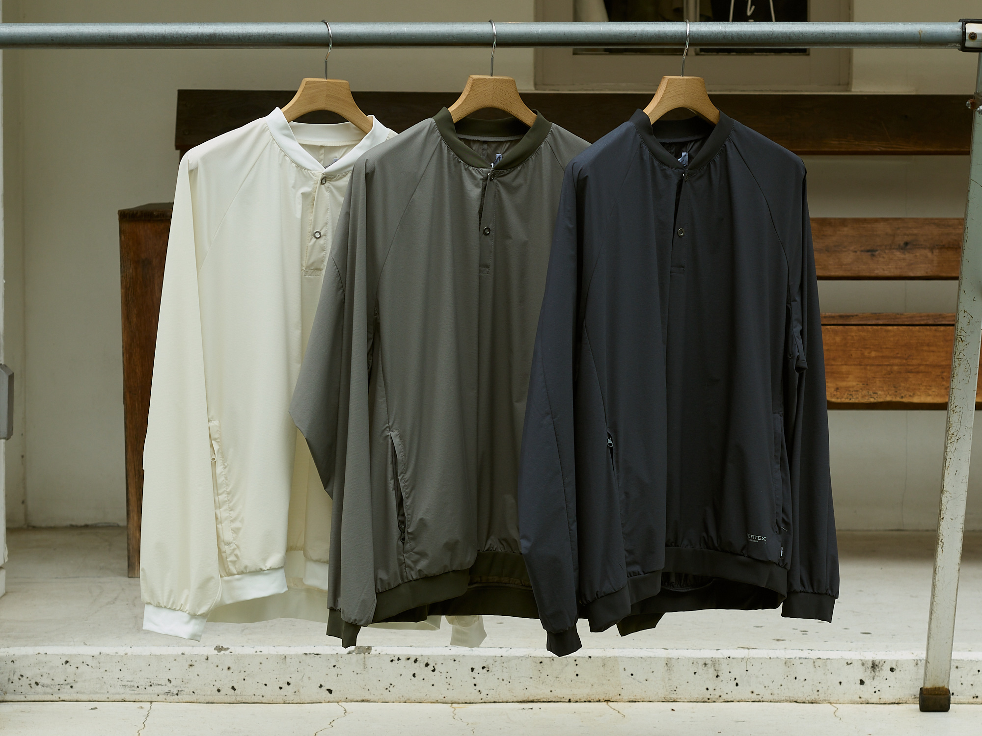 スナップの開け閉めで秋口はフーディーなどを仕込んでも良さそうです。ロンTとシェルの良いとこ取りなアイテム。