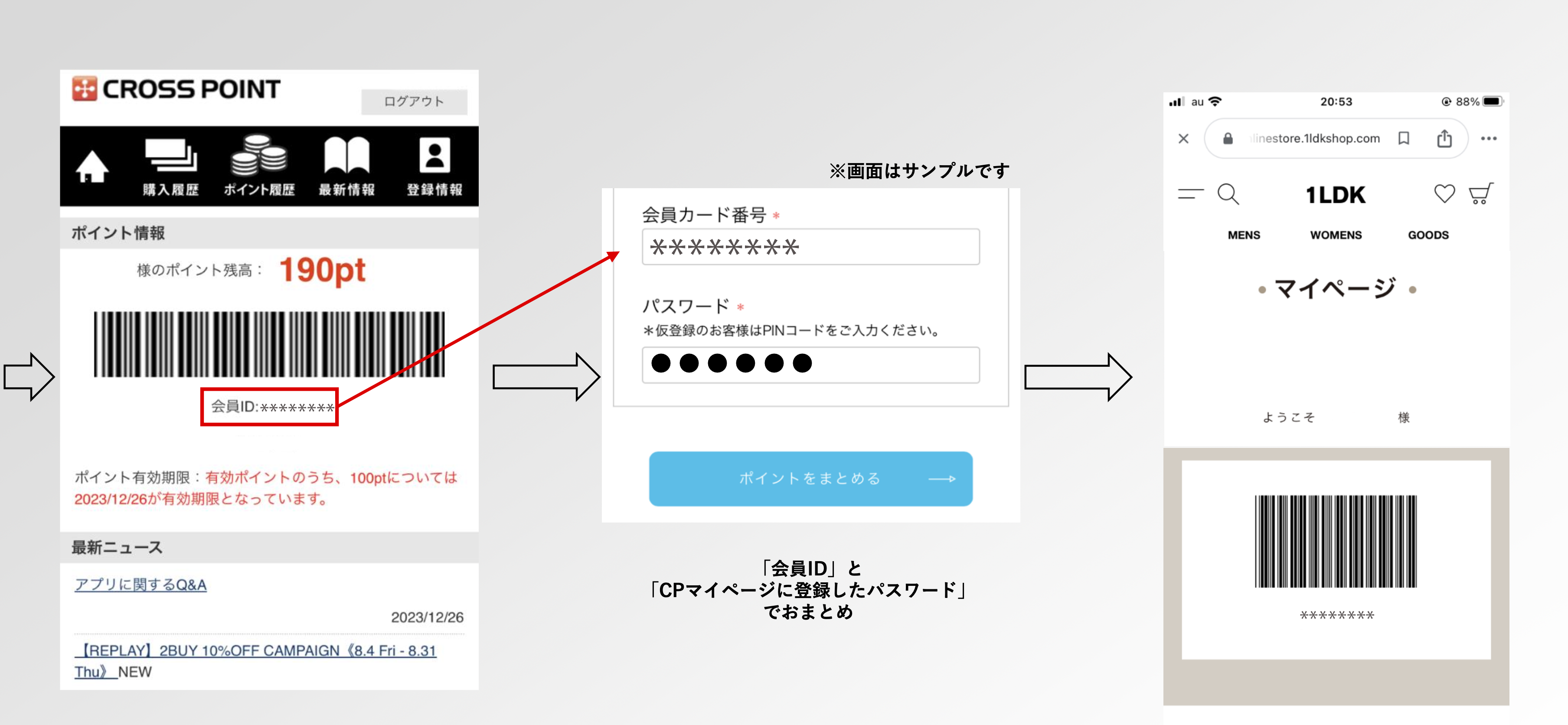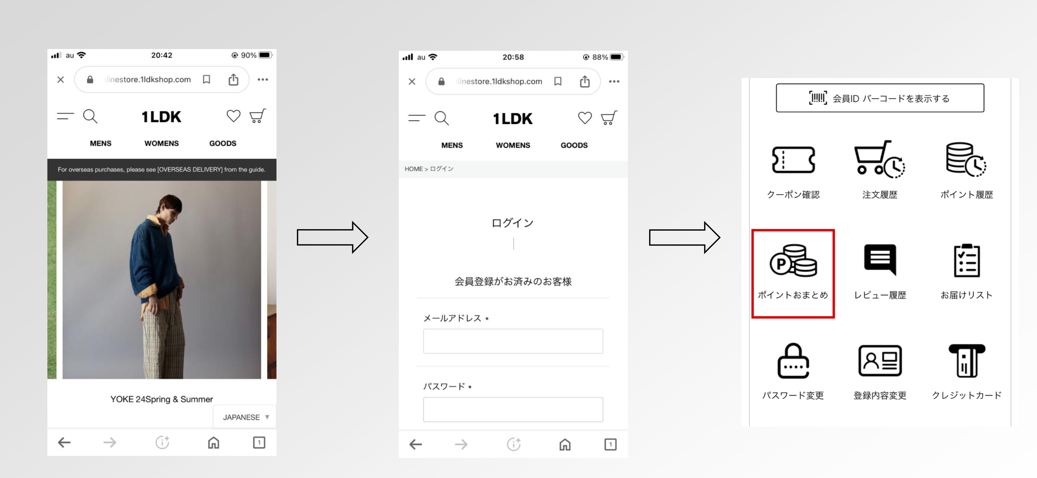 2024年5月9日(木)より1LDK ONLINE STOREと1LDK実店舗の会員システムが統合いたします。 統合以前に1LDK実店舗で付与いたしましたポイントは、お客さま自身でおまとめを行っていただく必要がございます。 下記手順を参考にお手続きをお願いいたします。